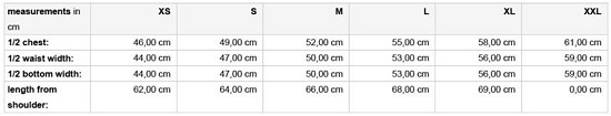 Velikostní tabulka: