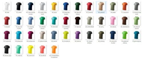 00 BÍLÁ, 01 ČERNÁ, 02 NÁMOŘNÍ MODRÁ, 05 KRÁLOVSKY MODRÁ, 07 ČERVENÁ, 12 TMAVĚ ŠEDÝ MELÍR, 94 EBONY GREY, 67 TMAVÁ BŘIDLICE, 36 OCELOVĚ ŠEDÁ, 03 SVĚTLE ŠEDÝ MELÍR, 51 LEDOVĚ ŠEDÁ, 08 PÍSKOVÁ, 38 ČOKOLÁDOVÁ, 27 KÁVOVÁ, 23 MARLBORO ČERVENÁ, 13 BORDÓ, 11 ORANŽOVÁ, A2 TANGERINE ORANGE, A1 KORÁLOVÁ, 30 RŮŽOVÁ, 49 FUCHSIA RED, 43 FUCHSIOVÁ, 64 FIALOVÁ, 15 NEBESKY MODRÁ, 14 AZUROVĚ MODRÁ, 87 PŮLNOČNÍ MODRÁ, 60 DENIM, 93 PETROLEJOVÁ, 44 TYRKYSOVÁ, 19 EMERALD, 95 MÁTOVÁ, A7 FROST, 39 TRÁVOVĚ ZELENÁ, 16 STŘEDNĚ ZELENÁ, 92 APPLE GREEN, 62 LIMETKOVÁ, 06 LAHVOVĚ ZELENÁ, 69 MILITARY, 09 KHAKI, 29 ARMY, 28 SVĚTLÁ KHAKI, 04 ŽLUTÁ, 96 CITRÓNOVÁ